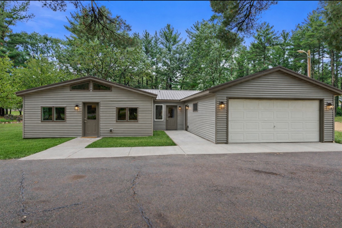 3 Bedrooms • 2 Bathrooms 2 Baths • Sleeps 1-8Eagle’s Nest West was completely renovated in 2024 and is located in a secluded setting with undeveloped lots on either side, yet walking distance to the Lure Bar & Grill and only 2.5 miles to Sand Valley. Just like all of our Eagle's Nest Guest House properties, it has been built out to comfortably host groups of 8 or less where each guest has their own bed within their own private home. NO BUNK BEDS OR SLEEPING ON SOFAS! The ranch style floor plan and amenities cater to golf groups, weddings, families visiting the Dells, and weekend warriors all the like. It’s a comfortable, convenient, and affordable stay that is tastefully decorated with personality and modern furnishings. The newly vinyl sided house is on approximately 2 acres privately situated in the tall pines (just 4 miles West of the other Eagle's Nest Guest House properties) and is 2,000 sq. ft. including 3 bedrooms, 2 bathrooms with lasting hot water and great water pressure, 8 beds, 1 rec room w/ flat screen smart TVs w/ HD, fully equipped kitchen, game room, back patio with grill and fenced backyard fire pit with chairs, infrared sauna, hot tub, key coded entrance (no keys necessary), ample parking, and much more!